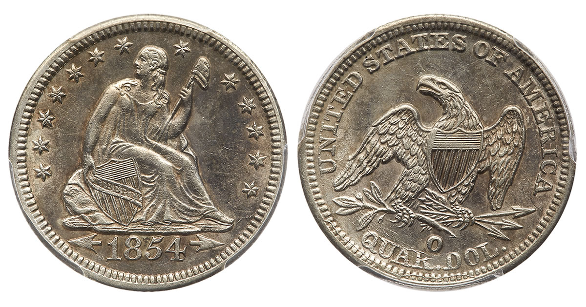 Also recovered from the ship and in the Goldberg’s September auction is a scarce 1854-O Liberty Seated Arrows at Date silver quarter-dollar Huge Mint Mark variety. It is graded PCGS AU55 CAC and among the finest known of its kind.