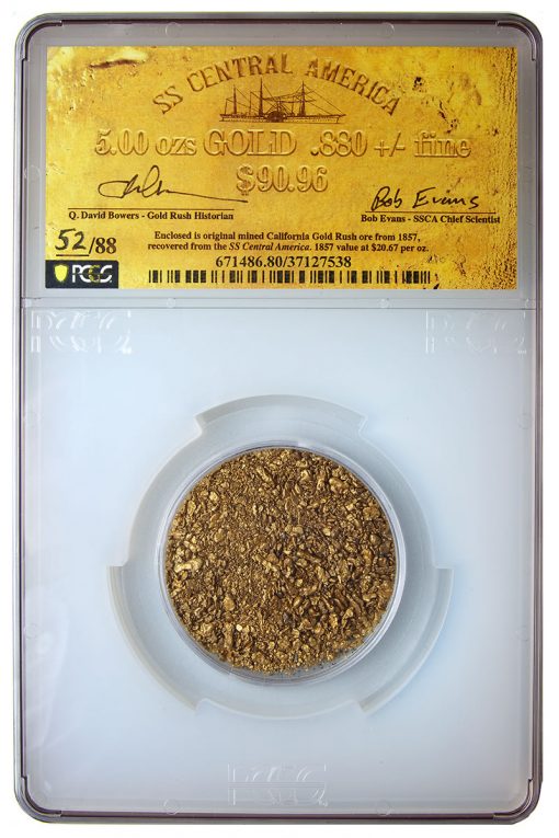 he insert label on the 5½ by 9 inches holder is personally signed by the esteemed Q. David Bowers, author of two books about the Gold Rush and the SS Central America, and by Bob Evans, the chief scientist on the Ship of Gold sunken treasure recovery missions.