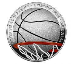 "The reverse design of the colorized silver dollar depicts a basketball with black seams about to pass through a white net, with its rim rendered in a familiar orange hue associated with the sport and the Hall of Fame."