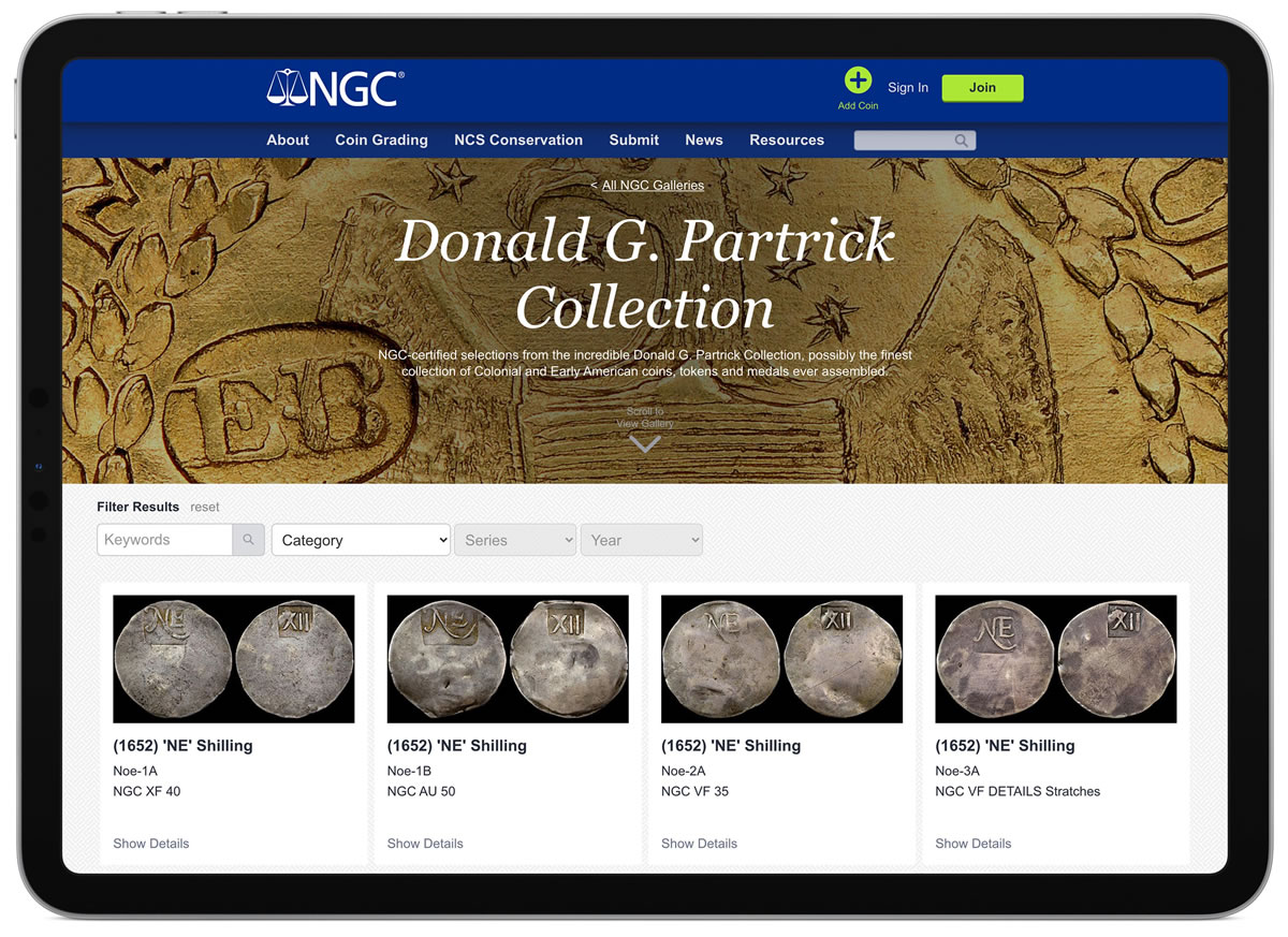 Numismatic Guaranty Corporation (NGC) has updated its image gallery of the Donald G. Partrick Collection with more than 1,000 additional coins, tokens and medals, giving numismatists the opportunity to explore this unparalleled collection of Colonial and early US coins.