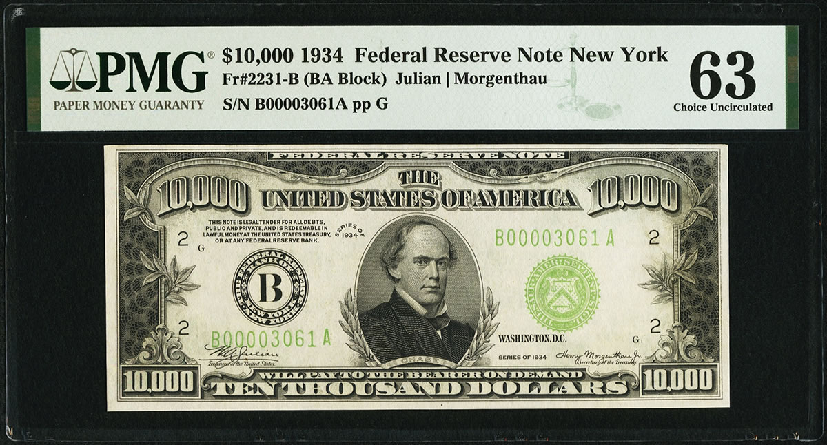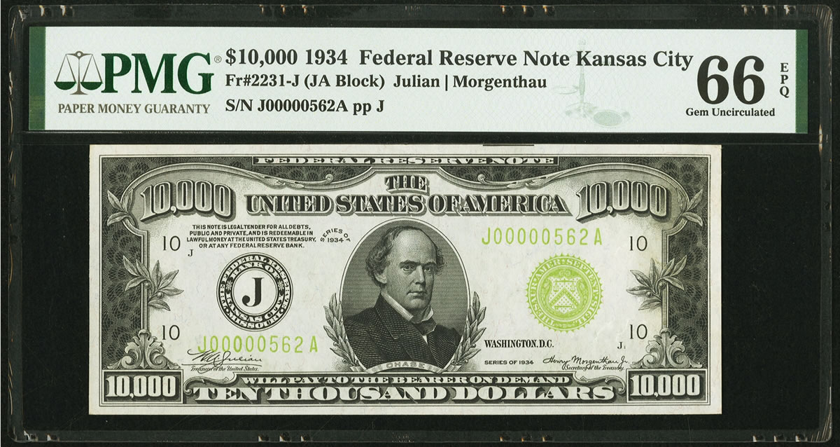 The top lot was a 1934 $10,000 Federal Reserve Note (Kansas City) graded PMG 66 Gem Uncirculated EPQ that realized $384,000. Unsurpassed in the PMG Population Report for 1934 $10,000 notes from all districts, this example easily exceeded its pre-auction estimate of $200,000 to $300,000.