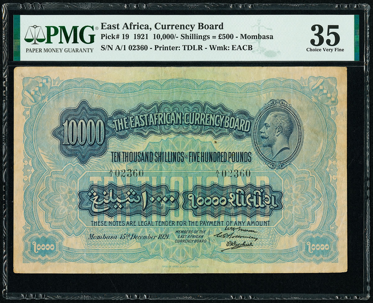 Meanwhile, a PMG-certified East Africa, Currency Board 1921 10,000/- Shillings = 500 Pounds graded PMG Choice Very Fine 35 realized $63,000, topping the world paper money sale.