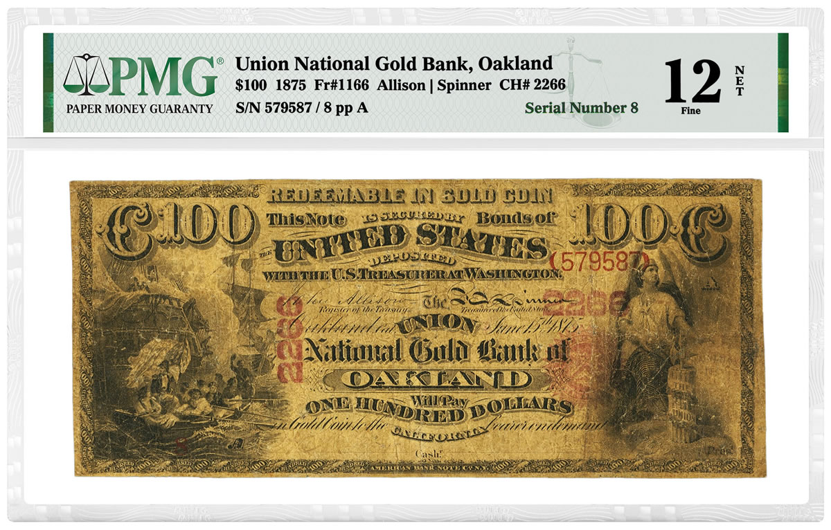 The other note in the sale with an estimate of $150,000 to $250,000 is an 1875 $100 National Gold Bank Note issued by Union National Gold Bank of Oakland. This unique note is graded PMG 12 Fine NET.