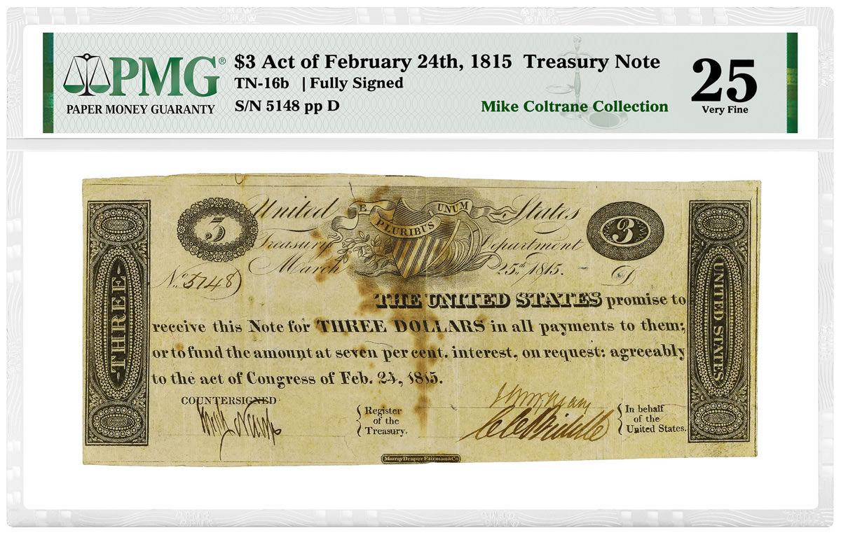 "The Coltrane Collection rarities, including the fantastic War of 1812 Treasury Notes, are a broad and complex group," said Dustin Johnston, Director of US Currency at Heritage Auctions. "The PMG team was the obvious choice for third-party certification, which we expect will help this collection achieve its full potential."