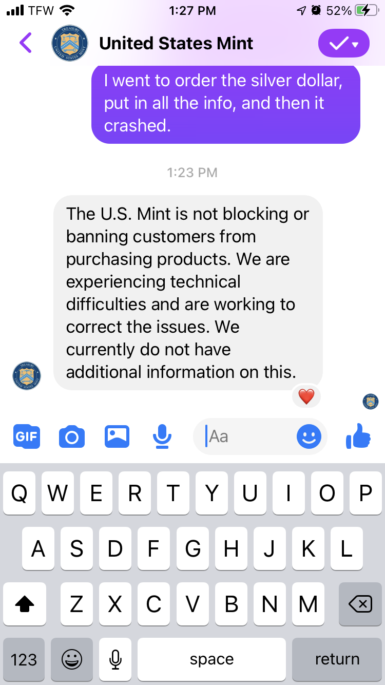 We want to assure you that the United States Mint remains committed to providing the highest possible level of customer service, and regret any inconvenience or frustration this buying experience caused."