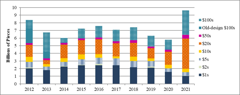The figures come from a print order approved and submitted by the Board of Governors of the Federal Reserve, the issuing authority for U.S. banknotes. It reflects the board’s estimate of net demand for currency in FY 2021 from both domestic and international customers.