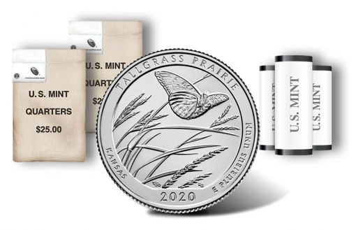 The United States Mint today started selling several products containing their newest quarter dollar. Now available are single 40-coin rolls, two-roll sets, three-roll sets, and 100-coin bags of 2020 Tallgrass Prairie quarters.