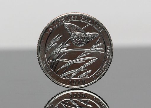 The reverse of each new quarter dollar offers a design honoring Tallgrass Prairie National Preserve. This image shows a skyward view of a Regal Fritillary butterfly against a backdrop of Big Bluestem and Indian grasses. Inscriptions read "TALLGRASS PRAIRIE," "KANSAS," "2020," and "E PLURIBUS UNUM."
