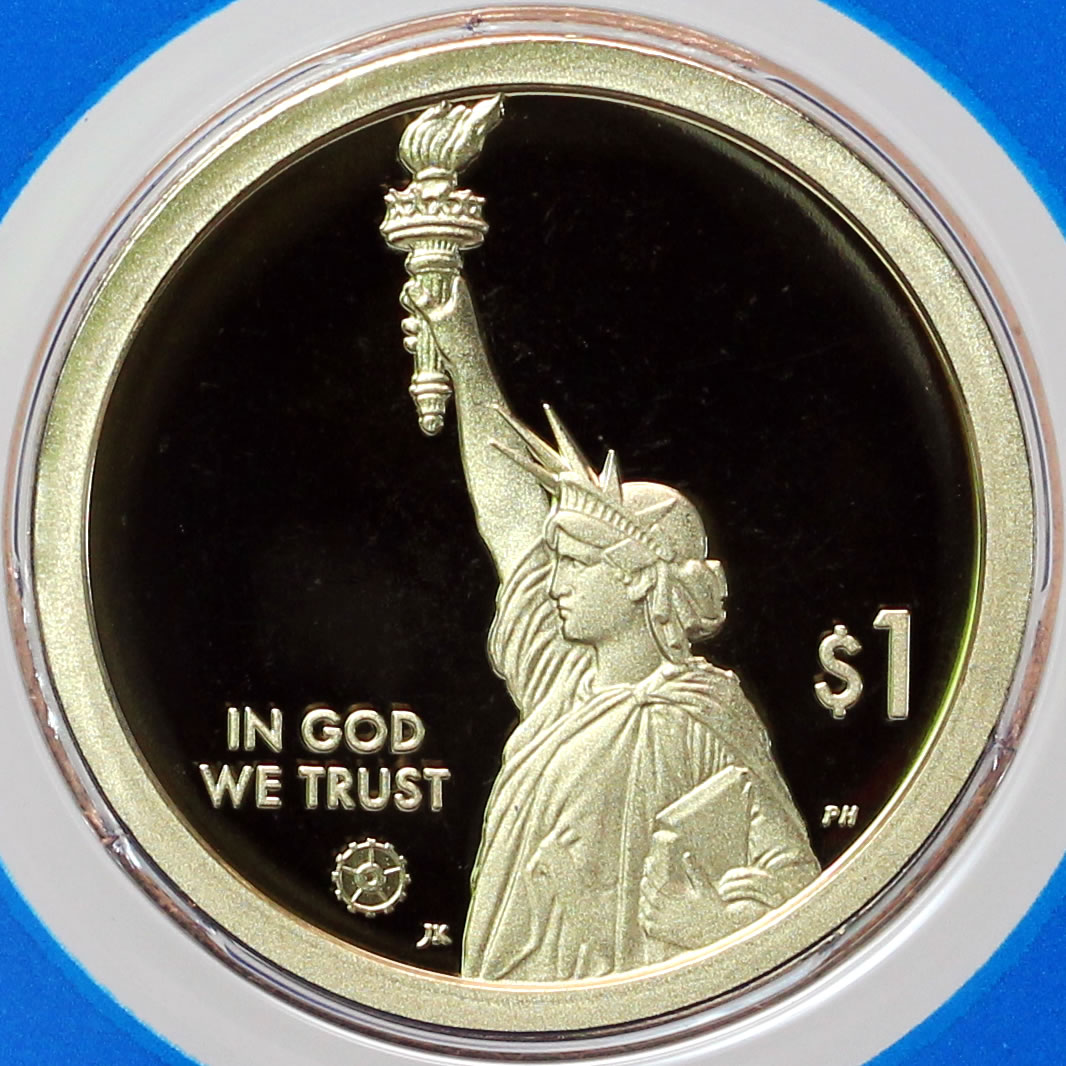 All coins of the Innovation series bear the same obverse (heads side) representation of the Statue of Liberty in profile as designed by Justin Kunz and sculpted by Phebe Hemphill. Obverse inscriptions read "IN GOD WE TRUST" and "$1." 2020 dollars also feature a small privy mark of a stylized gear that is different from the one used for 2019-dated dollars.
