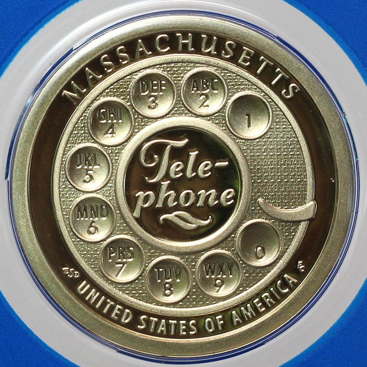 As mentioned earlier, the reverse (tails side) of Massachusetts Innovation $1 Coins depict the face of a rotary telephone. The design honors Massachusetts inventor Alexander Graham Bell and the device he called the "tele-phone."