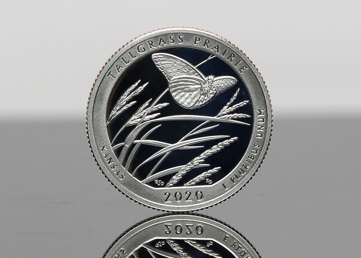 Emily Damstra created the Tallgrass Prairie coin design while Renata Gordon sculpted it. Shown is a skyward view of a Regal Fritillary butterfly against a backdrop of Big Bluestem and Indian grasses. The grasses are native to the region.