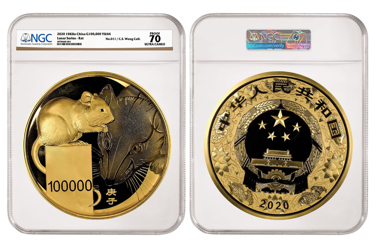 Numismatic Guaranty Corporation (NGC) has certified two more colossal gold coins, both 2020 Year of the Rat issues from China. Together, the coins contain over $700,000 USD in gold, but their numismatic value is significantly greater. Each of them has earned NGC’s highest grade: NGC PF 70 Ultra Cameo.
