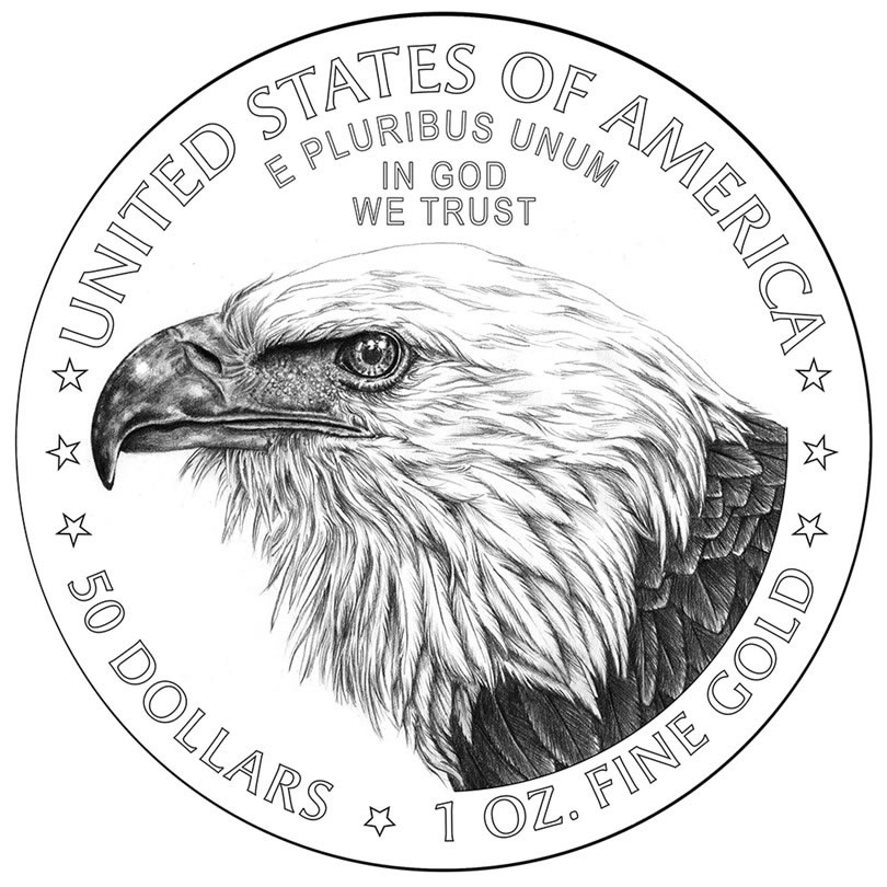 To choose the Eagles’ new reverses, the US Mint conducted a sweeping competition that began with more than 30 possible designs. Norris’ design was selected for the Gold Eagle from this expansive field of candidates.