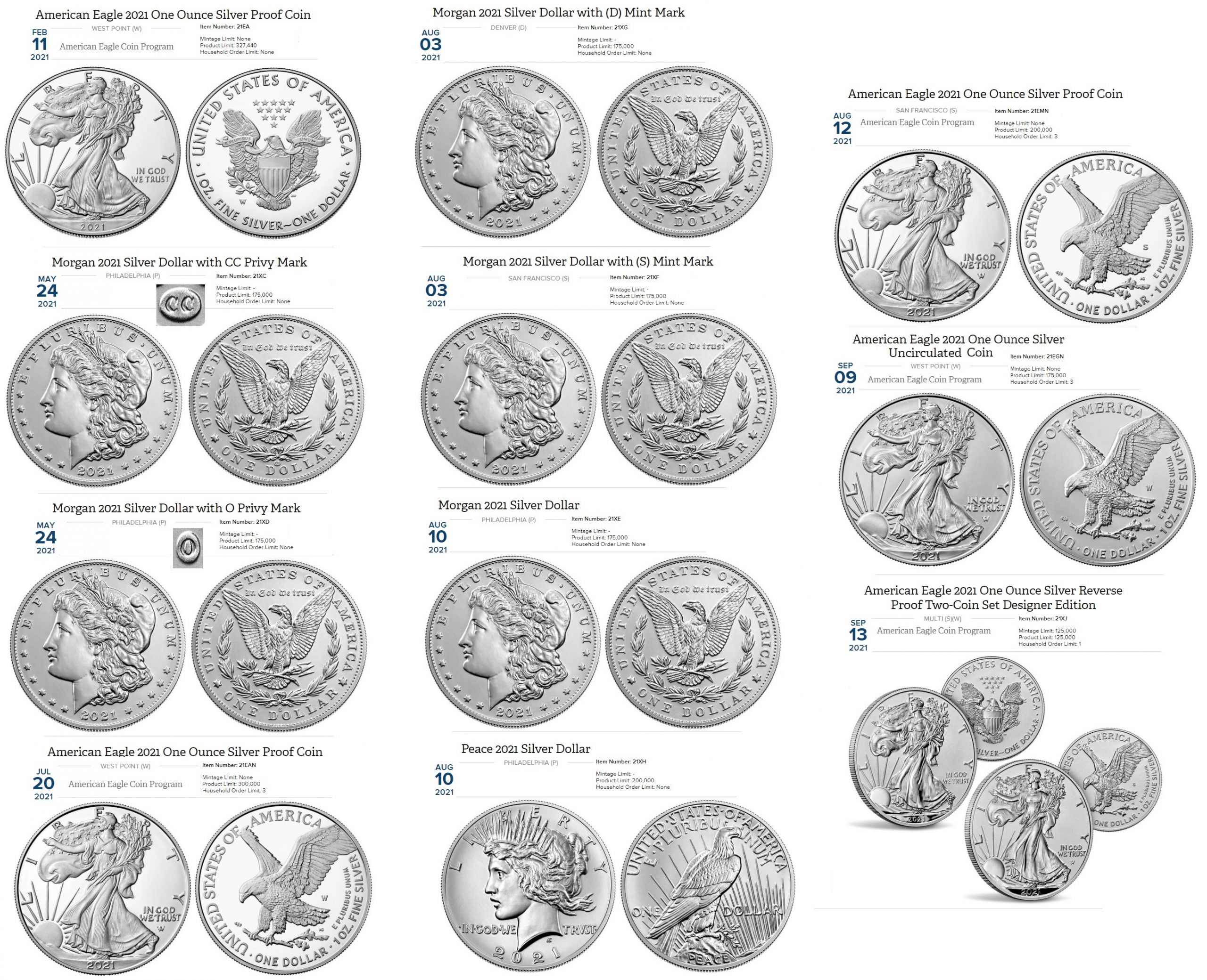 2021 Silver Eagle Variations as of 2021 1008 without Prices but with Dates