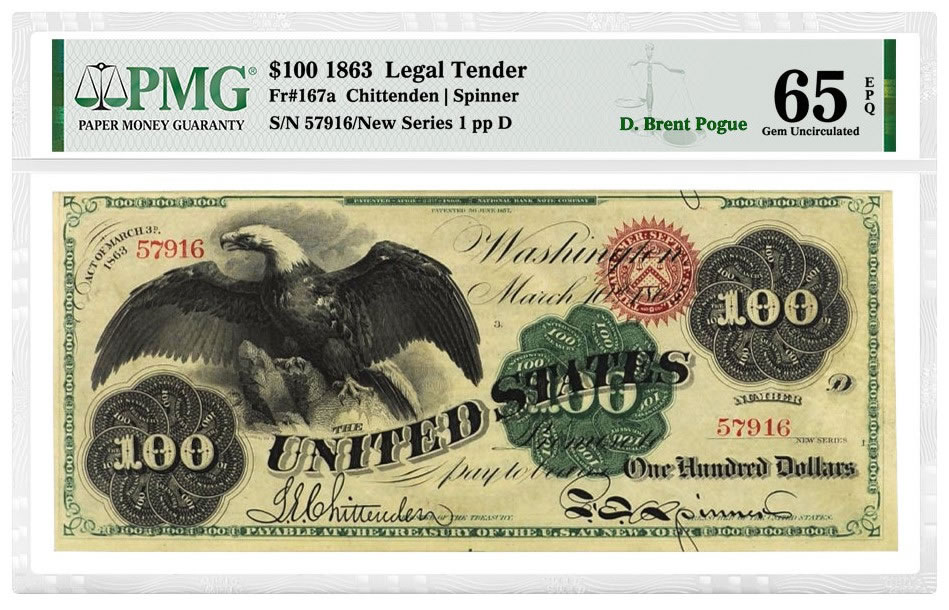 In March 2020, the PMG-certified Pogue Collection realized more than $9 million in a Stack’s Bowers auction. Amazingly, 27 notes in the collection realized at least $100,000, led by an US 1863 $100 Legal Tender that realized $432,000.