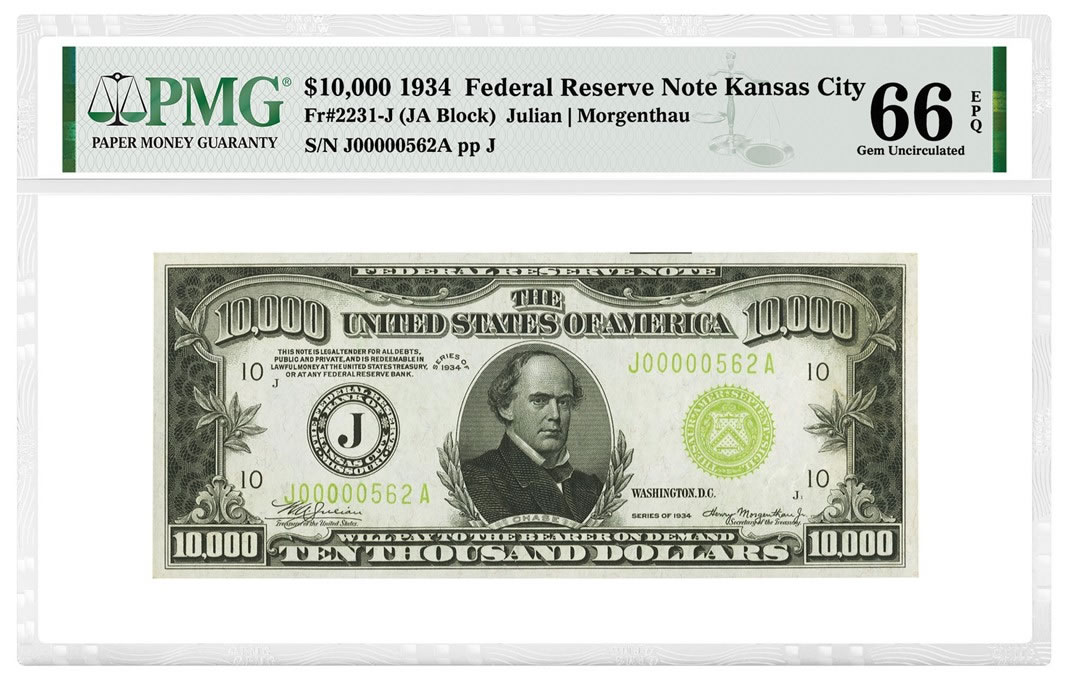 In September, a terrific PMG-certified US note, a 1934 $10,000 Federal Reserve Note (Kansas City), realized $384,000 in a Heritage Auctions sale. This set a world record for any piece of small-size US currency.