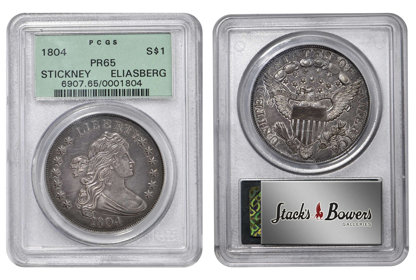 The top two were an 1804-dated Draped Bust Class I silver dollar graded by Professional Coin Grading Service (PCGS) Proof-65 sold by Stack’s Bowers Galleries for $3,360,000 and a 1927-D Saint-Gaudens Double Eagle ($20 denomination gold coin) graded PCGS Mint State-65+ sold by Heritage Auctions for $2,160,000.