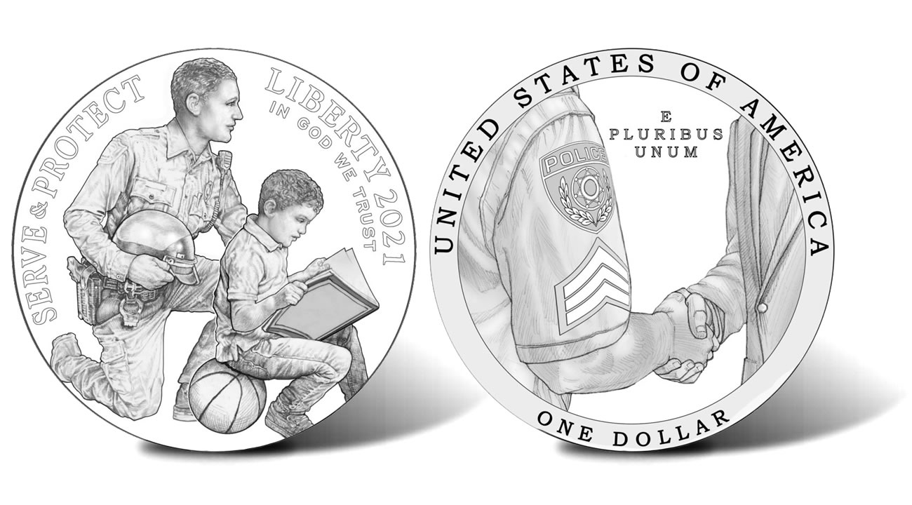 Silver dollar obverses depict a police officer kneeling next to a child, who is reading a book and sitting on a basketball, symbolizing service to the community and future generations. Inscriptions are "SERVE & PROTECT," "LIBERTY," "2021," and "IN GOD WE TRUST."