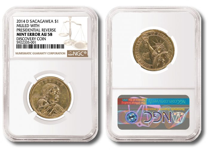 This incredible error, which paired a Sacagawea Dollar obverse with a Presidential Dollar reverse, was struck in 2014 at the Denver Mint. It is now graded NGC Mint Error AU 58 with a notation of Discovery Coin to recognize its important place in numismatic history.