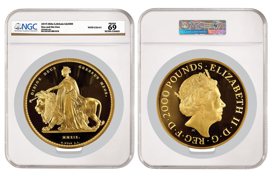 The coin, struck with 2 kilograms of gold, pays tribute to the iconic 1839 Una and the Lion design created for a young Queen Victoria. The current monarch, Queen Elizabeth II, is depicted on the other side. NGC attributed the coin with Certificate of Authenticity #1, from a mintage of only four.