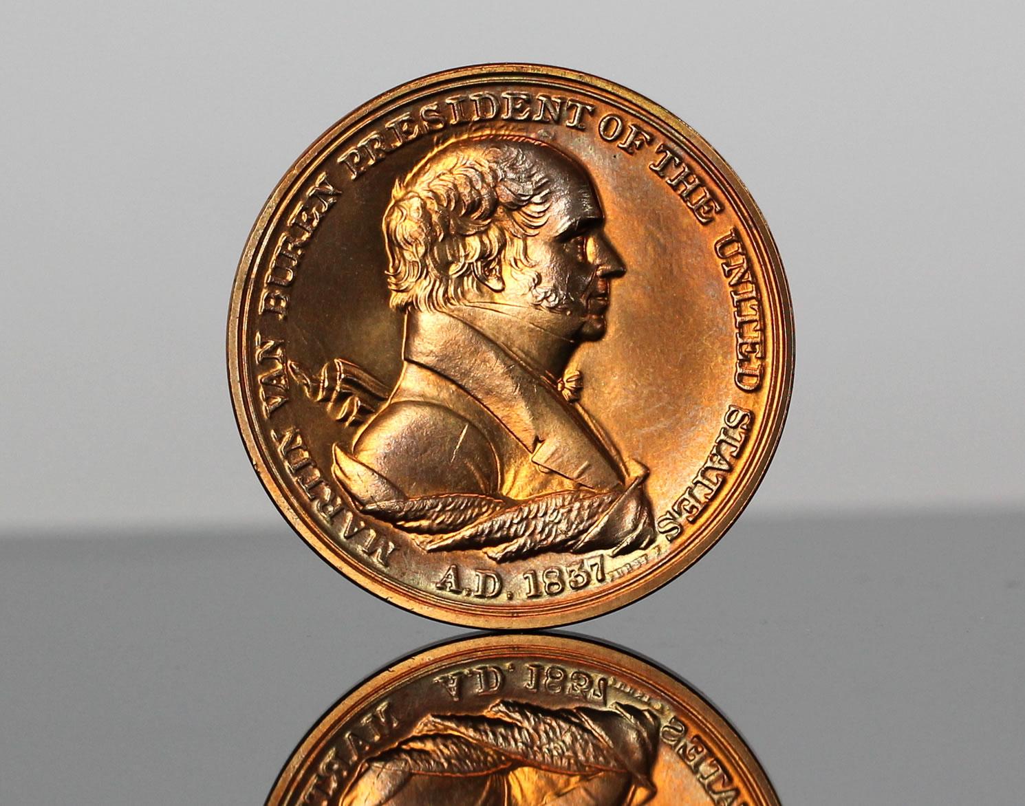 A right-facing portrait of Martin Van Buren adorns the medal’s obverse (heads side). The portrait is surrounded by the inscriptions of "MARTIN VAN BUREN," "PRESIDENT OF THE UNITED STATES," and "A.D. 1837." The likeness of the eighth President was designed and sculpted by Moritz Furst.