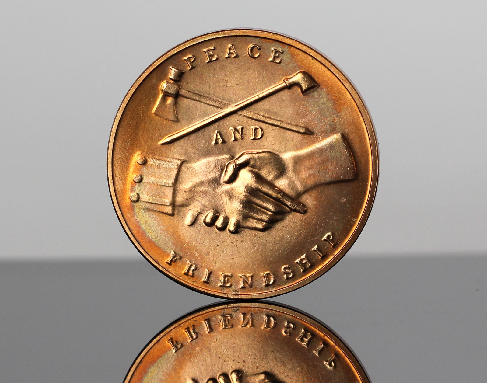 The medal bears the same reverse (tails side) as previous presidential silver medals. This includes two hands clasped in token of amity and a crossed peace pipe and tomahawk appearing above.