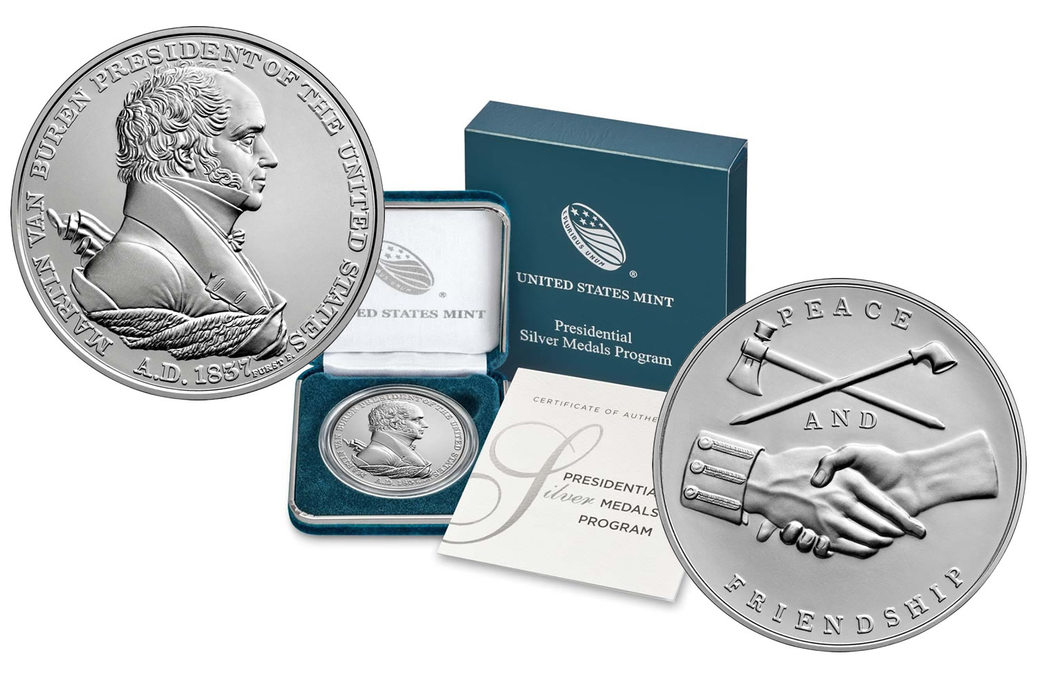 The medal is composed of one troy ounce of 99.9% fine silver and features a portrait of Van Buren, the eighth President of the United States.
