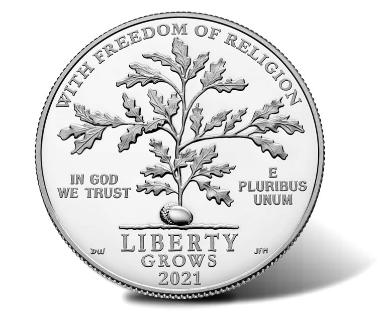The new product is the first in a five-year series continuing through 2025 with obverse (heads side) designs reflecting the five freedoms in the First Amendment to the United States Constitution — Freedom of Religion, Freedom of Speech, Freedom of the Press, Freedom to Peaceably Assemble, and Freedom to Petition the Government for a Redress of Grievances.