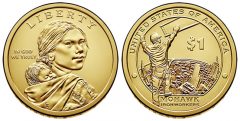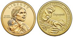 Obverses (heads side) of Native American $1 Coins share the same portrait of "Sacagawea" as designed by sculptor Glenna Goodacre. The familiar image has been around since the Sacagawea golden dollar debuted in 2000. Inscriptions around Sacagawea read "LIBERTY" and "IN GOD WE TRUST."
