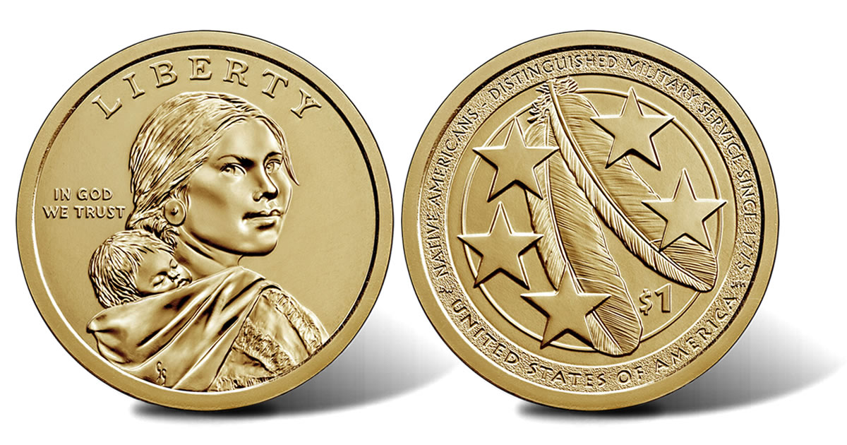 Honoring the service of American Indians in the U.S. military, the dollar’s reverse (tails side) depicts eagle feathers, which were traditionally earned in battle or by performing a brave deed. The design was selected from among a total of 17 candidates.