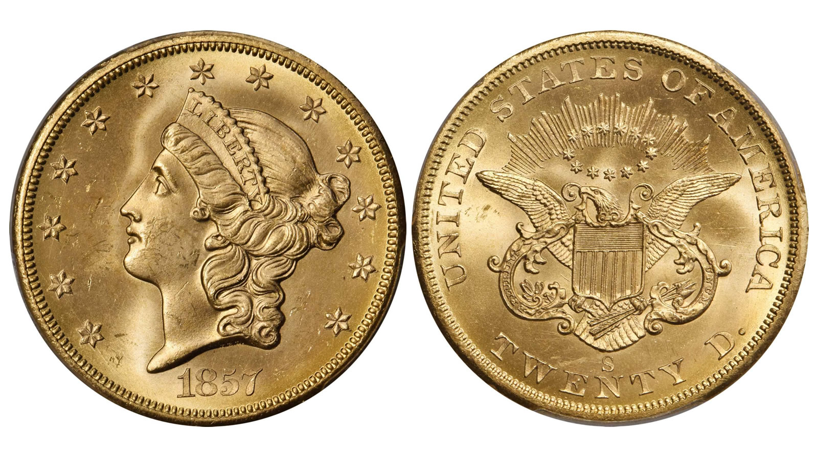 The Bimyway Collection features small cents, silver dollars, and other popular denominations in Choice or Gem Mint State grades, including an exciting MS-64+ (PCGS) 1857-S double eagle with pedigree to the S.S. Central America shipwreck.