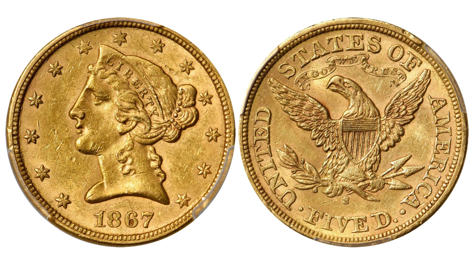 An impressive offering of silver dollars and gold coins is from the Collection of Silas Stanley Roberts (1888-1966), which was assembled chiefly in the first half of the 20th century and now comes to market for the first time. It includes a Top Pop AU-58 (PCGS) 1867-S $5 among many other rarities.