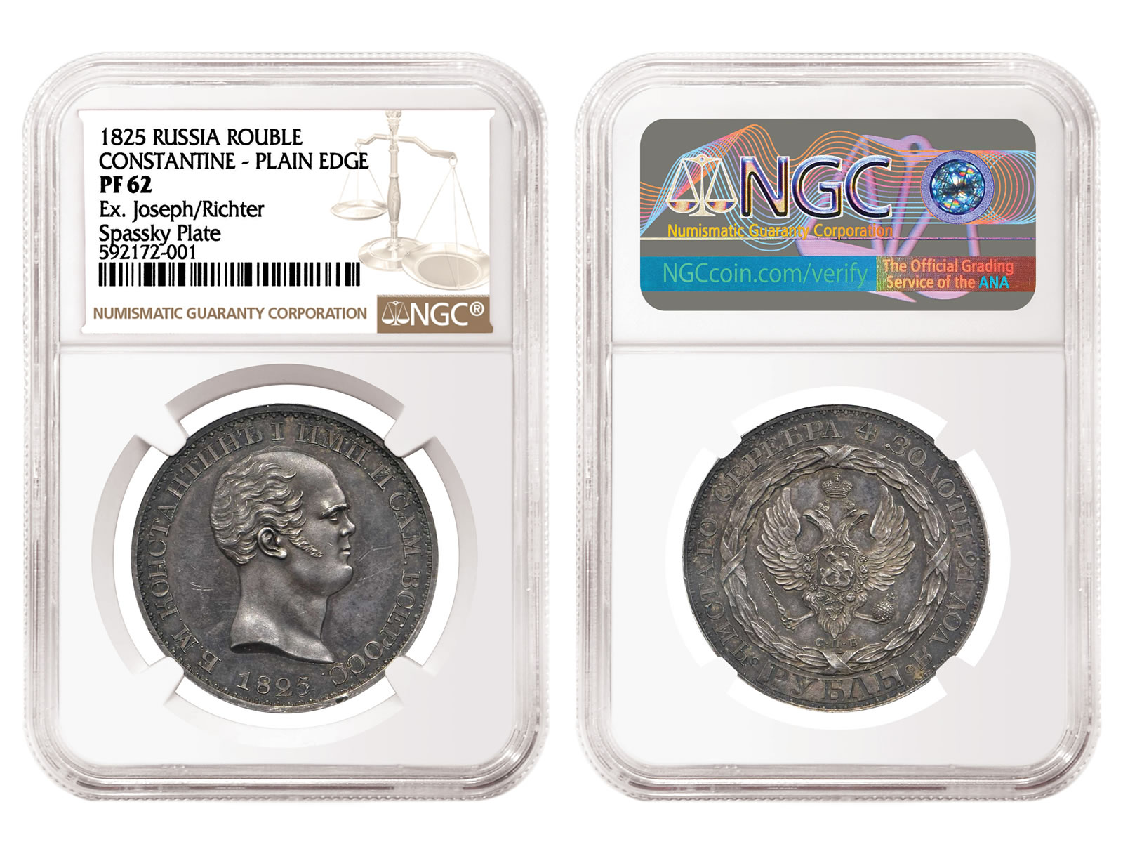 a Russia 1825 Rouble graded NGC PF 62 and pedigreed to Joseph, Richter and the Pinnacle Collection that realized $2.64 million on April 6, 2021