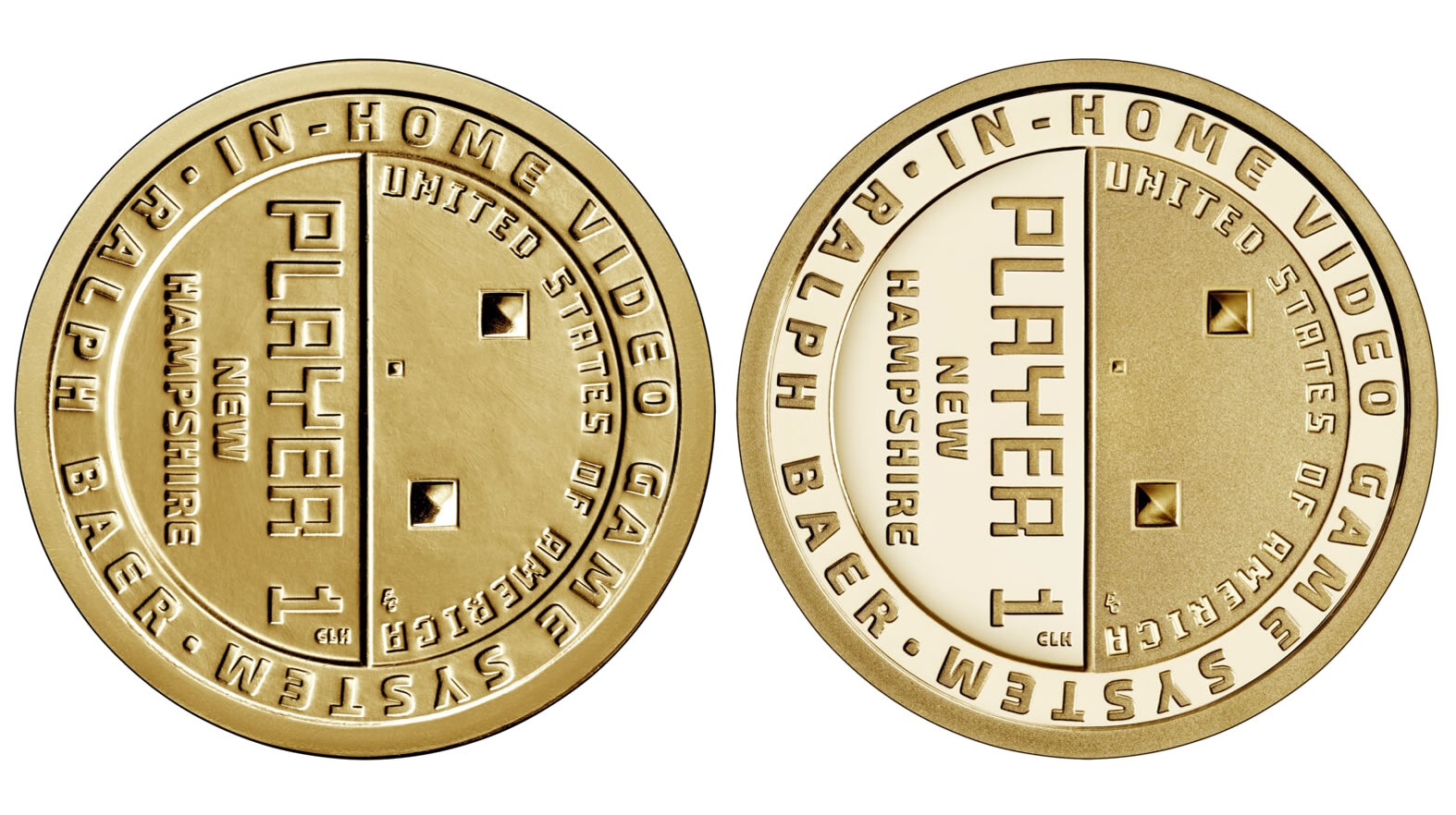 The New Hampshire $1 Coin recognizes Ralph Baer and his creation of the first home video game console. This design depicts Ralph Baer’s brown box game "Handball" on the right side of the coin. The left side of the coin features "New Hampshire" and "Player 1" on an incused background. "IN HOME VIDEO GAME SYSTEM" and "RALPH BAER" encircle the outside of the coin in a text that is meant to pay homage to Ralph Baer’s Odyssey game. The design of the coin is also symbolic of an arcade token.