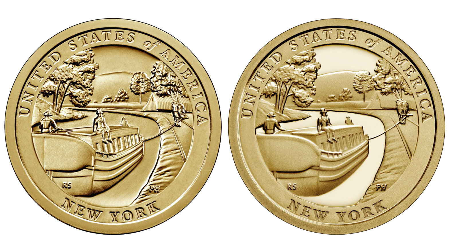 The New York $1 Coin pays homage to the Erie Canal. This design depicts a packet boat being pulled from a city in the East toward the country areas to the West. Inscriptions are "UNITED STATES OF AMERICA" and "NEW YORK."
