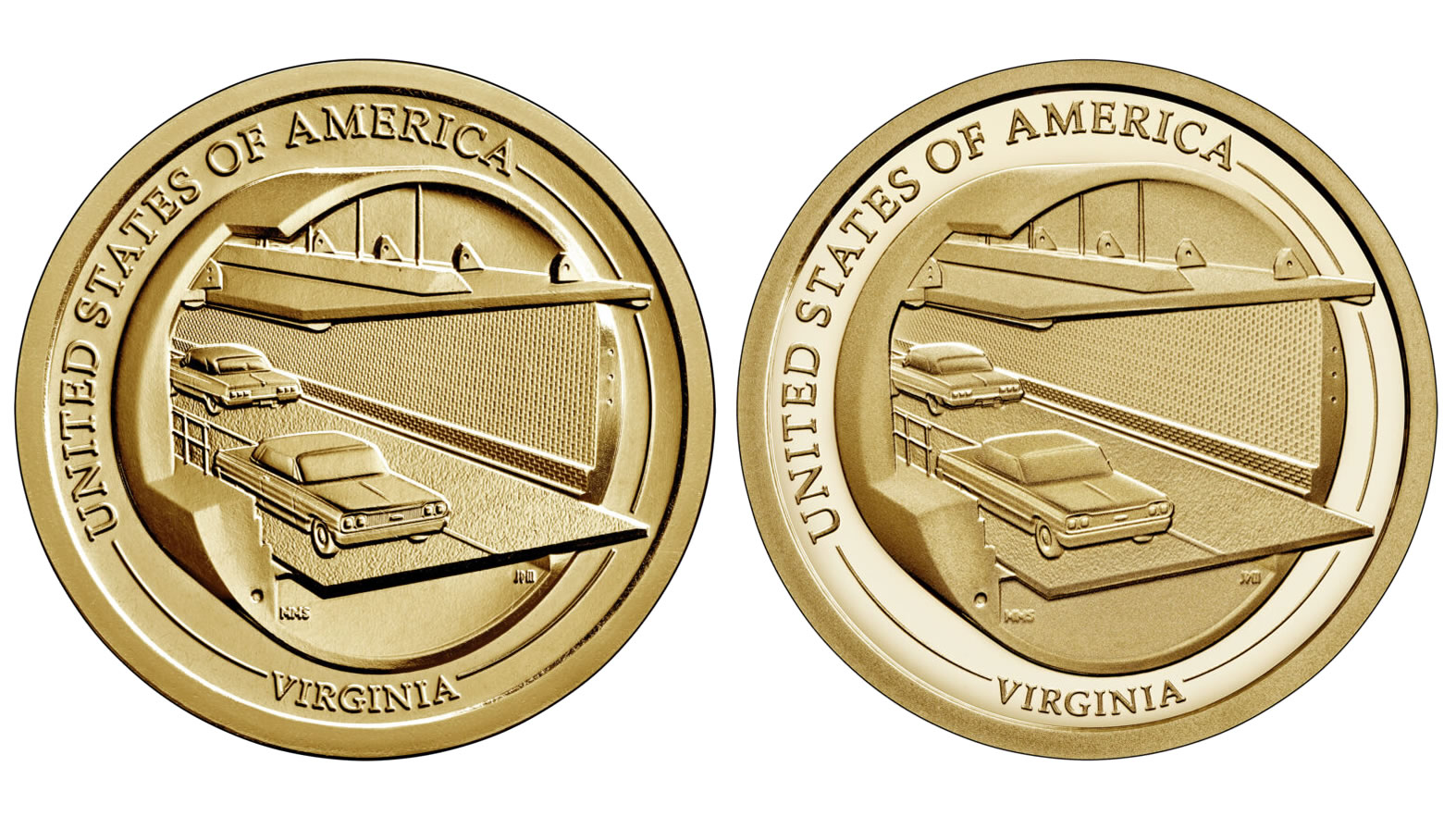 The Virginia $1 Coin recognizes the engineering marvel of the Chesapeake Bay Bridge-Tunnel. This design depicts a view of the Chesapeake Bay Tunnel as a cross section cut away, illustrating the ingenuity involved in constructing it. Inscriptions are "VIRGINIA" and "UNITED STATES OF AMERICA."