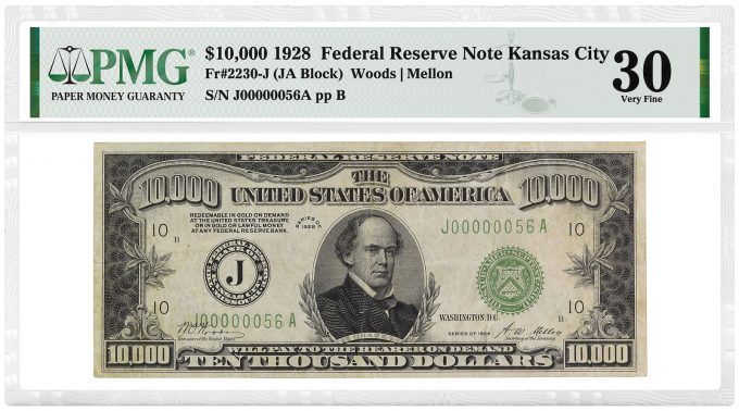 The 1928 $10,000 Federal Reserve Note (Kansas City) graded PMG 30 Very Fine (lot 22175) nearly doubled its pre-auction estimate of $250,000 and up. Only 10 of these 1928 Series notes are known to have survived, including two in museums, according to Heritage. This exceptionally rare piece is also the first of these notes known from the Kansas City District.