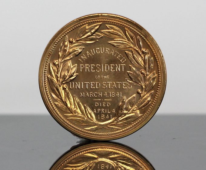 For the reverse design, we find a laurel wreath within a pearled ring with inscriptions of INAUGURATED PRESIDENT OF THE UNITED STATES MARCH 4, 1841. DIED APRIL 4, 1841.