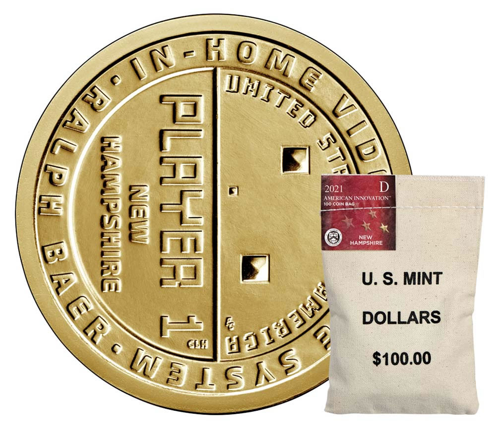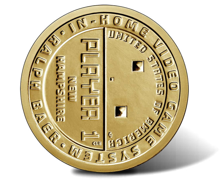 The design’s right side offers a depiction of Ralph Baer’s brown box game "Handball" along with an inscription of "UNITED STATES OF AMERICA." The left side shows "PLAYER 1" and "NEW HAMPSHIRE" on an incused background. "IN HOME VIDEO GAME SYSTEM" and "RALPH BAER" are inscribed around the edge of the design, paying homage to Baer’s Odyssey game. In addition, the complete design is symbolic of an arcade token.
