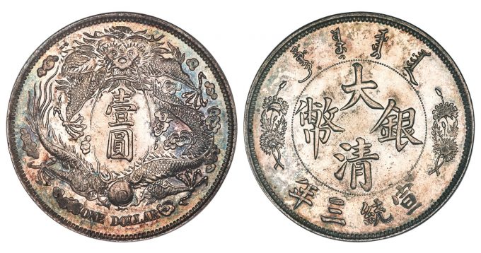 From the same era, a 1911 Chinese Hsüan-t’ung silver Pattern "Long-Whiskered Dragon" Dollar Year 3, MS63 NGC, is an exquisite example of an extreme rarity and artistic accomplishment. The 1911 Long-Whiskered Dragon Pattern, by Luigi Giorgi, is among the most instantly recognizable and fiercely sought of the late Imperial silver dollars. Its MS63 grade nears the peak of NGC’s census.