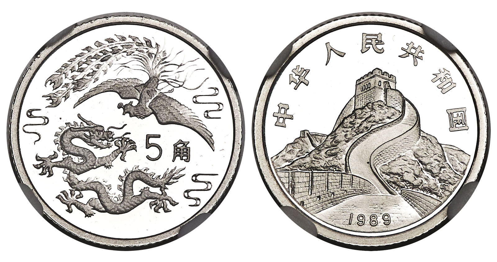 An immensely rare silver 1989 Proof Pattern "Dragon & Phoenix" 5 Jiao, Ultra Cameo NGC, is one of the scarcely encountered smaller denominations from the series, and features two of the most recognizable symbols to grace the People’s Republic’s coinage. Certified on the edge of perfection with nary a visual detractor to dilute the prominently contrasted "Dragon & Phoenix" motifs, for which the series is named, this specimen is unrivaled, with none graded finer.
