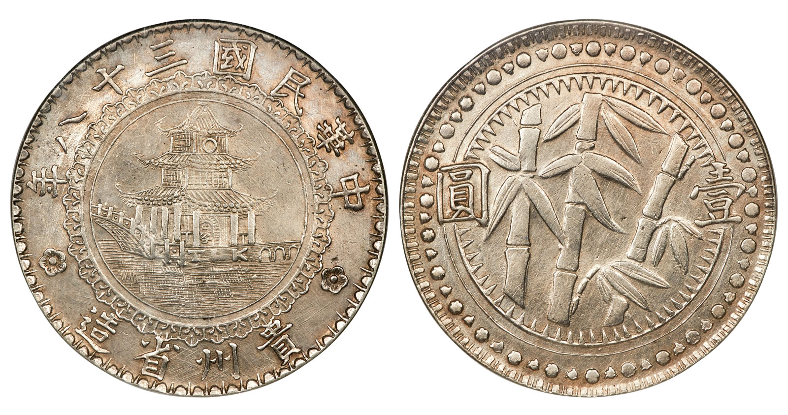 An almost Uncirculated 1949 Kweichow Republic "Bamboo" Dollar Year 38 (1949), AU50 NGC, is a considerable rarity for this highly collectible province whose silver coinage is among the most popular in the Republican series. Perhaps even more elusive than the famed Auto Dollar and the first ever offered by Heritage Auctions, the Bamboo Dollar was produced amidst the turbulent years of the 1940s, standing as the final issue produced prior to the Communist victory in October of the same year.