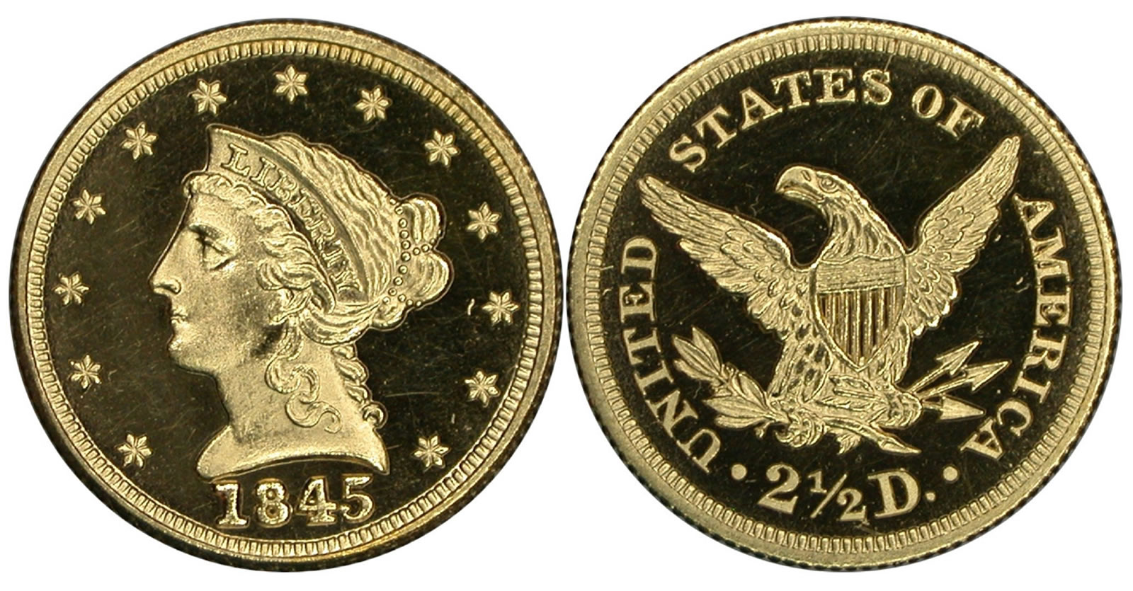 The finest assembled 1845 gold proof set with an original velvet-lined presentation box: $10 Eagle NGC PF65 CAM; $5 Half Eagle NGC PF66 CAM; and $2.50 Quarter Eagle NGC PF67 CAM.