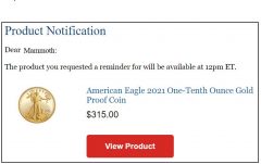 | 2021-W Proof $5 Gold Coin | 1,131 | 1,150 | 19 | 1.68% |