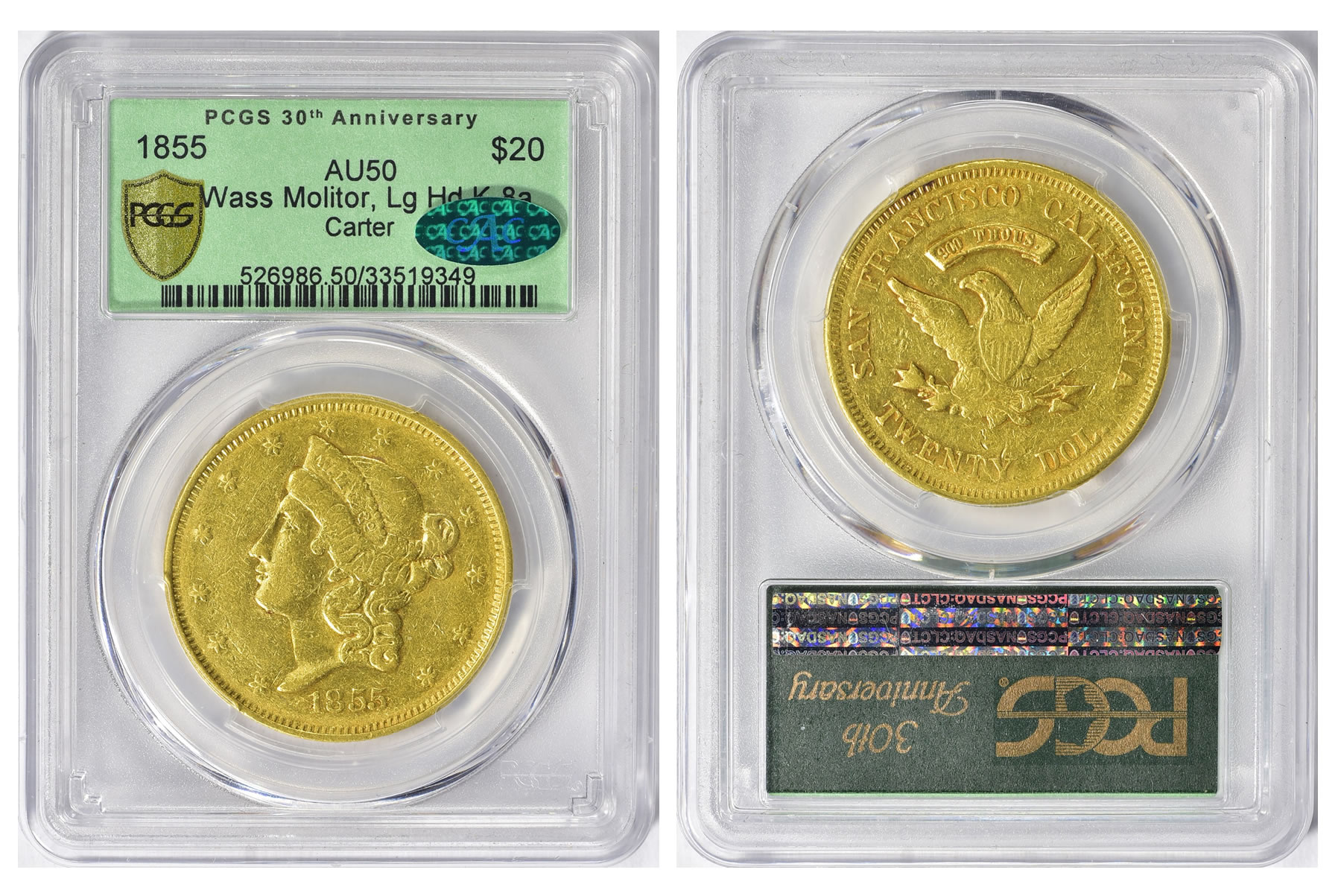 Excessively rare 1855 $20 Wass, Molitor & Co. Large Head Twenty Dollar, (K-8a). PCGS AU-50 CAC. Unique. One of only four known Large Head Wass Molitor Twenty Dollar coins, and unique by variety. It is the only example approved by CAC. Listed in A Guide Book of U.S. Coins, commonly referred to as the Red Book, as a unique variety. When this coin last sold in 2014 it was discovered that unlike the other three examples known, it used the reverse die of the Small Head Wass Molitor Twenty. The other three used a slightly different reverse die.