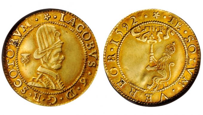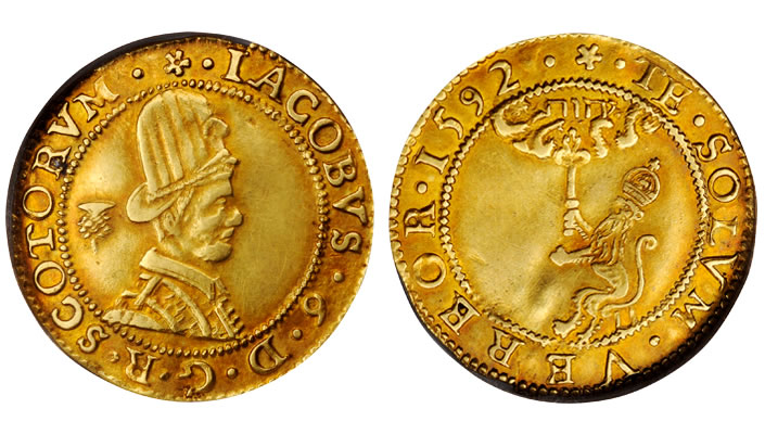This comprehensive offering of types and denominations includes over 100 coins and medals, ranging from the minuscule John Baliol halfpenny to the magnificent gold 20 pound piece of James VI, the largest gold issue of the British Isles. This 20 pound piece, with provenance to the Bridgewater House Collection begun in the 17th century, plays the leading role amid an ensemble of historic treasures, many of which are world-class rarities in their own right.