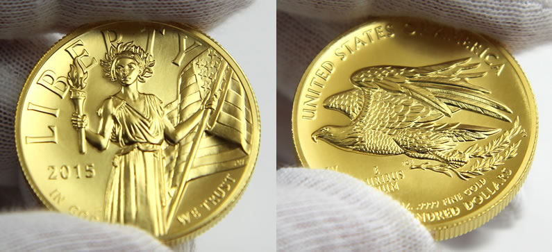 Reverse inscriptions include E PLURIBUS UNUM, 1 OZ., .9999 FINE GOLD, $100 and UNITED STATES OF AMERICA.