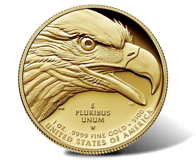 Found on the gold coin’s reverse is a close-up view of an eagle with an open beak as designed by Artistic Infusion Program Artist Richard Masters and sculpted by Medallic Artist Phebe Hemphill.