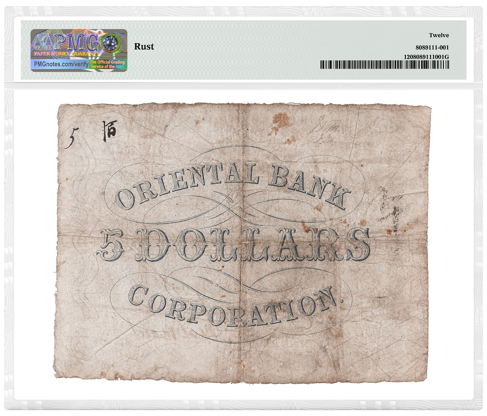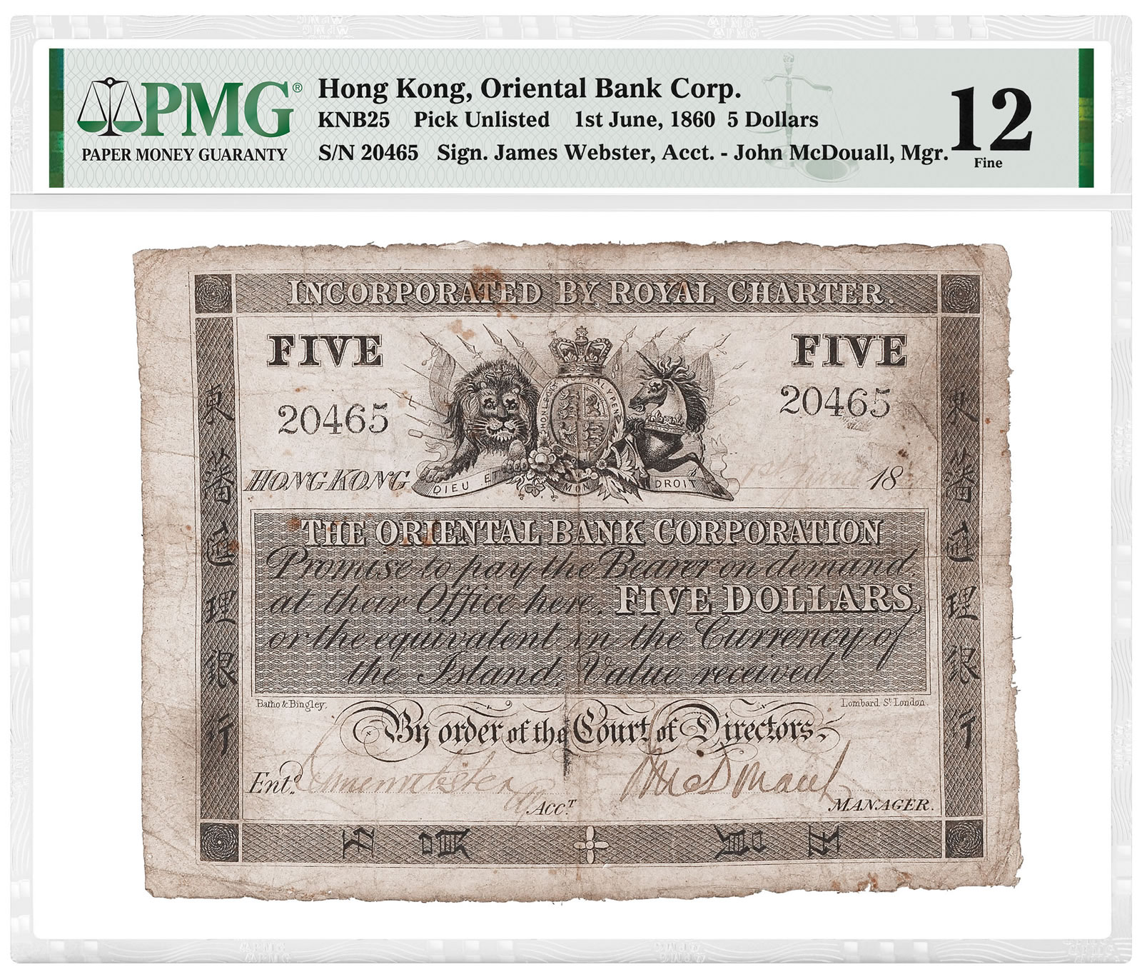 Graded PMG 12 Fine, the Hong Kong, Oriental Bank Corp. June 1, 1860 5 Dollars helps illuminate the numismatic history of the Chinese city that today is home to over 7 million people. Until 1858, the Oriental Bank Corporation was the only bank to issue notes in rapidly growing Hong Kong, which was then a British colony with a tiny fraction of its current population.