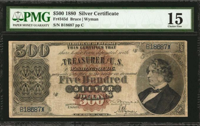 The standout highlight of the sale was a Fr. 345d 1880 $500 Silver Certificate graded PMG Fine 15 — the only privately available example of the catalog number — that realized $504,000. It had been off the market since its last public auction sale in 2006.